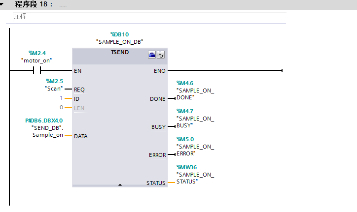 本人使用S7-1200PLC CPU1214,开放式用户通信TSEND指令,TSEND在发送数据时偶尔会丢失,REQ参数的输入是M2.5的上升沿,本人猜想是不是在Main中M2.5从前一个周期到当前周期产生了上升沿,但是在当前周期TSEND指令没有执行,到下一个周期时,M2.5已经没有上升沿了。