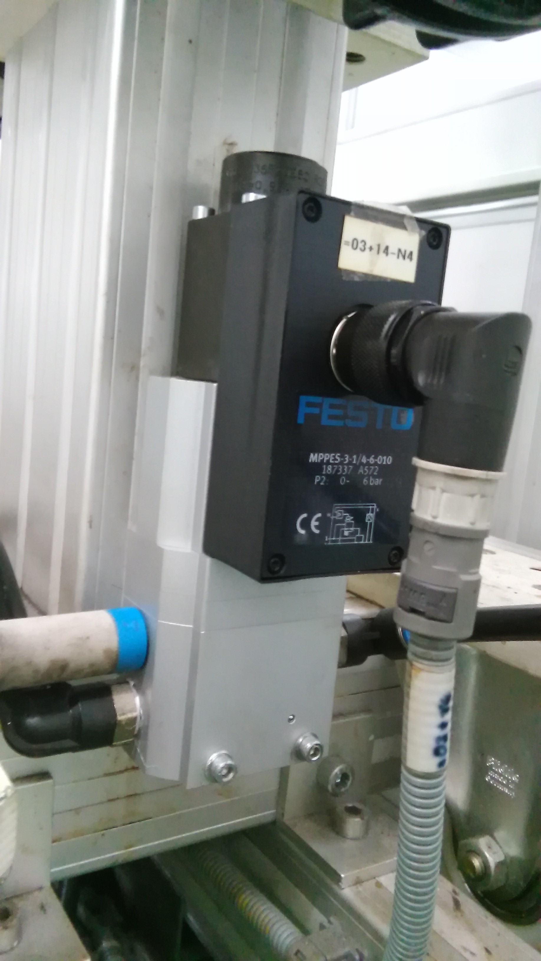 今天将仓库内放置了10年的德国原装FESTO的MPPES气动比例阀,为防止放置时间过长,将备件比例阀安装到现场替换使用了10年依旧完好的比例阀,早年前当时嫌这个比例阀不漂亮及粗大,使用SMC的ITV比例阀代替,这个日本的比例阀比较小巧,最大的优点就是在阀体上有一个可以显示当前输出压力的显示屏,但是很遗憾ITV的比例阀使用不到半年后工作不正常了(也许是因为压缩空气不是特别干净,内有些油污造成),没有办法只有继续使用FESTO的比例阀直到现在还是完好。