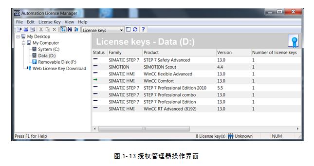 在安装TIA博途软件时,必须安装授权管理器。授权管理器可以传递、检测、或删除授权,操作界面参考图1- 13所示: