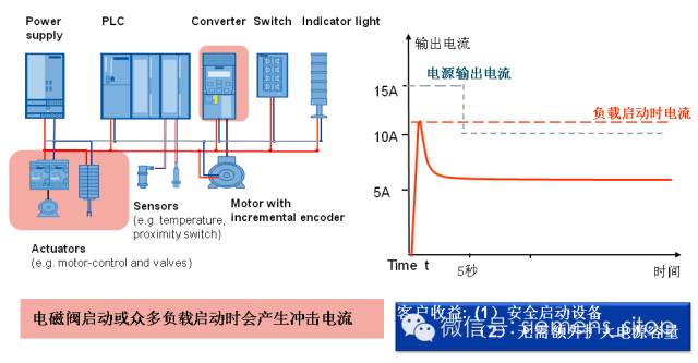 工业应用场合中,经常会遇到一些具备浪涌电流特性的负载,比如电磁阀、直流电机、电容性负载等,这些负载一般在启动时的短时电流很大,持续工作时电流则维持在恒定水平。也有一些应用场合,在实际工作过程中,有时要启停一些感性或容性负载,这就需要电源具备短时较强的功率输出能力,以维持输出的稳定。