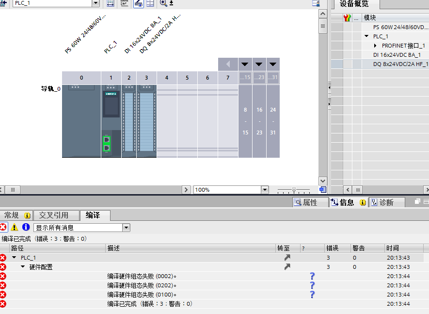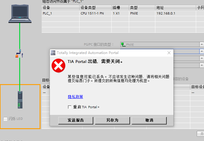 现在遇到的问题是:组态好一个简单1500PLC硬件后编译提示组态失败,依次点击“仿真--开始搜索” 弹出出错画面,再点击取消或发送报告,程序自动退出,几次都这样,没检查出什么问题,另外编写的程序可以编译通过,触摸屏也可以正常仿真,请问大家这是怎么回事,要怎样处理。