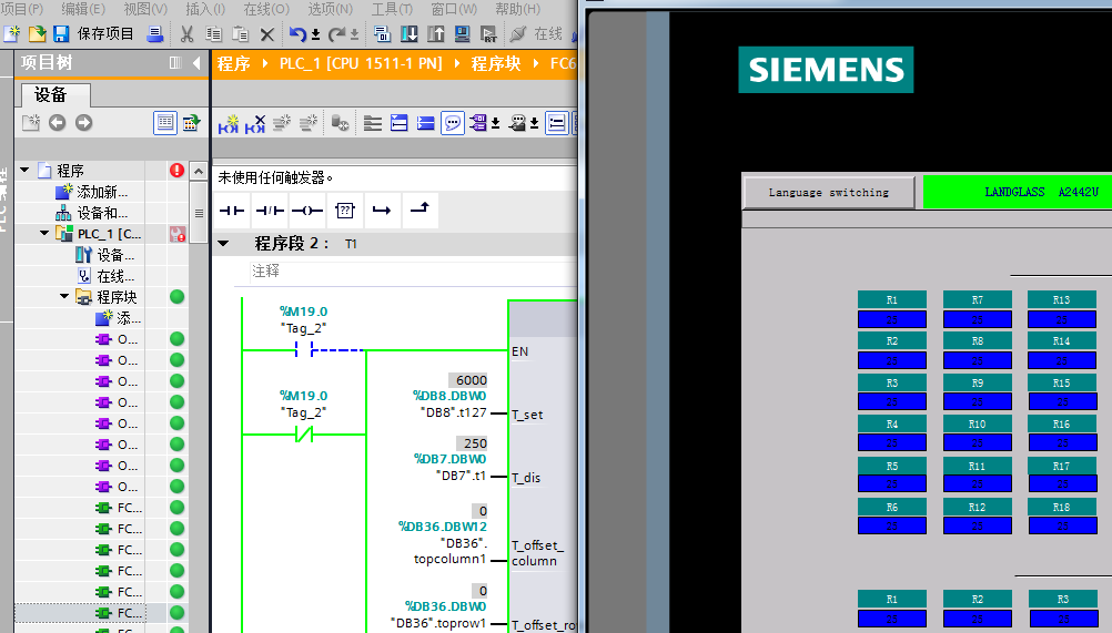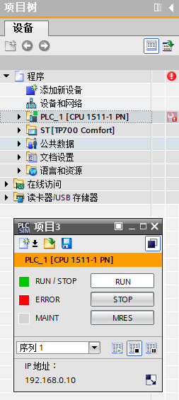 查找问题的时候发现有提问者问了在TIA V13 SP1中测试双仿真的问题,看到专家说目前实现不了,当时的日期是2015-11-10 12:43:15,这勾起了我的兴趣。测试环境:STEP 7 Professional V13 SP1 Update 7WinCC Advanced V13 SP1 Update 7S7-PLCSIM V13 SP1模拟硬件:S7-1500(1511-1PN)TP700 Comfort测试经过:1、通过STEP 7 Professional V13打开STEP7程序并下载程序到S7-PLCSIM中。2、通过WinCC Advanced V13 打开操作面板程序,打开项目树里的”连接“项,修改相应IP。3、选中操作面板程序名称,点击菜单栏中的开始仿真按钮,即可仿真。[br至此,即可实现PLC和操作面板双仿真。