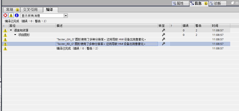 博图wincc 提示画面使用多种分辨率。这将导致HMI设备出现像素化。