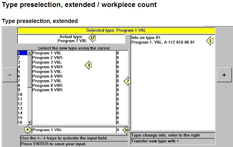 而在S_H6中,他也是写的类型,这个写是指trfansline 2000向DB59中写入。但这里同样可以在PLC中去写入(是说DBW2922---DBW2984工件类型代码),就相当于transline 2000去读,这个工件类型代码就是图1中的7号位置,这个位置的数值可以在屏幕上却写入,也可以在PLC中去写入,是双向的。任何一方的改变,在另一方马上就会显示出来。比如我在工件类型1的位置,定义他是工件代码10,这个时候如果在屏幕上输入10的话,那么在DBW2922中马上会显示A(16进制),如果我们改变这个DBW2922到6,那么在屏幕上工件1的相应位置7那里也会马上变化成6。