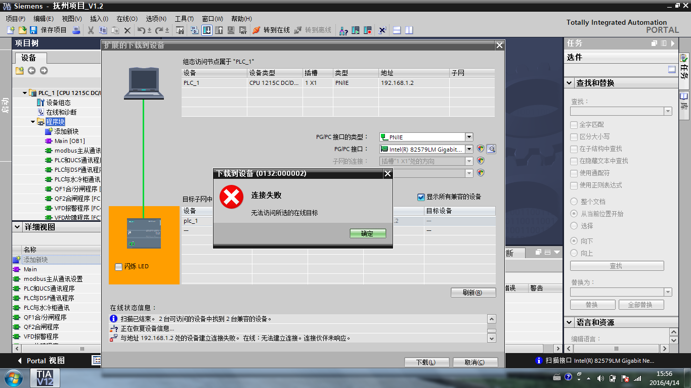 我用PORTAL V12软件下载程序时出连接失败是什么原因,用别的电脑下载也出现这问题。软件在闪烁灯上打钩PLC也闪的,就是下程序时报错还是就是没法在线。