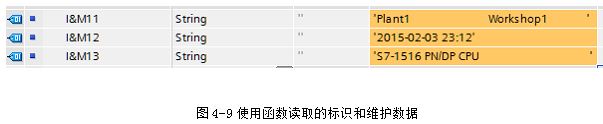 工厂标识和位置标识符可以用于识别设备和设备所处的位置,工厂标识最多可输入32个字符,位置标识最多可输入22个字符,附加信息最多可以输入54个字符。CPU可以使用函数“Get_IM_Data”将信息读取出来以进行识别。读出的信息如图4-9所示。