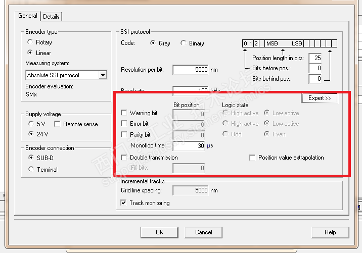 设备是simotion D425-2DP,通过SMC30节位移传感器的编码器,在scout中配置外部编码器时,总是连接不成功。想知道是不是expert中的参数没有设置,请教这些参数怎么设置,我用的是线性绝对值编码器,SSI协议的,24V电压。请大家指教小弟。谢谢!