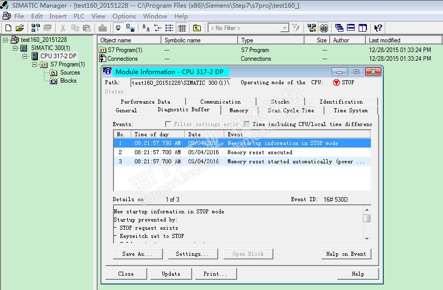 这个论坛或百度都有,简单图示下,联机,点在CPU上,然后点击PLC下的诊断,模块信息,点诊断缓存区,这里就有显示故障内容。一般I/O错误(主要为对地短路) ,站点丢失等。
