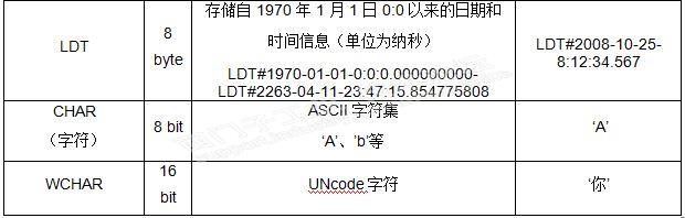 WCHAR(宽字符)的操作数长度为2个字节,该数据类型以Unicode格式存储,可存储所有Unicode格式的字符,包括汉字、阿拉伯字母等所有以Unicode为编码方式的字符。汉字“你”以WCHAR表示的示例为:WCHAR#'你'。