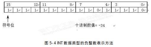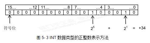 一个INT类型的数包含16个位,在存储器中占用一个字的空间。第0位至第14位表示数值的大小。第15位为符号位,表示数值的正负。以二进制编码表示一个数值时,除符号位以外将每一位的数值进行加权和计算即可表示一个整型数,例如以整型方式表示+34的位图排列如图5- 3所示。