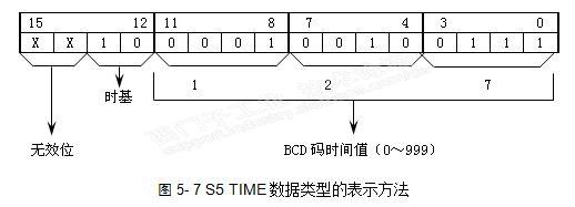 其中h表示小时;m表示分钟;s表示秒;ms表示毫秒。时间数据以BCD码的格式存储于16个位中,例如时基为1秒(时间最小分辨率为1秒),时间值为127秒的表示方法如图5- 7所示。
