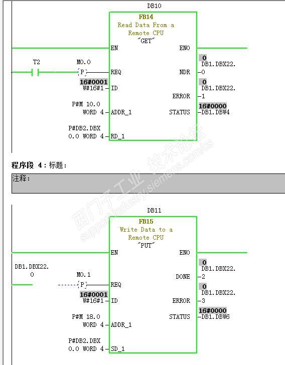 6、新建FB功能块,调用FB14“GET”和FB15“PUT”这两个块,如下图所示,ID为W#16#1,ADDR_1为远程站数据地址,RD_1为本地存放数据地址,编写完成后,将所有程序及硬件下载到PLC中,然后在线监视即可发现数据已经正常传输。