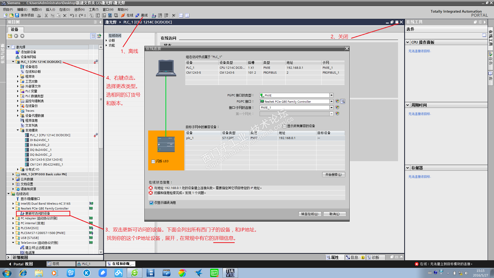 1、用网线直连(可以通过交换机。);如果使用了路由器,PLC的IP不能是路由器的网关IP。在分配PLC的IP过程中,不要用无线连接(因为,LLDP协议不能执行,找不到PLC)