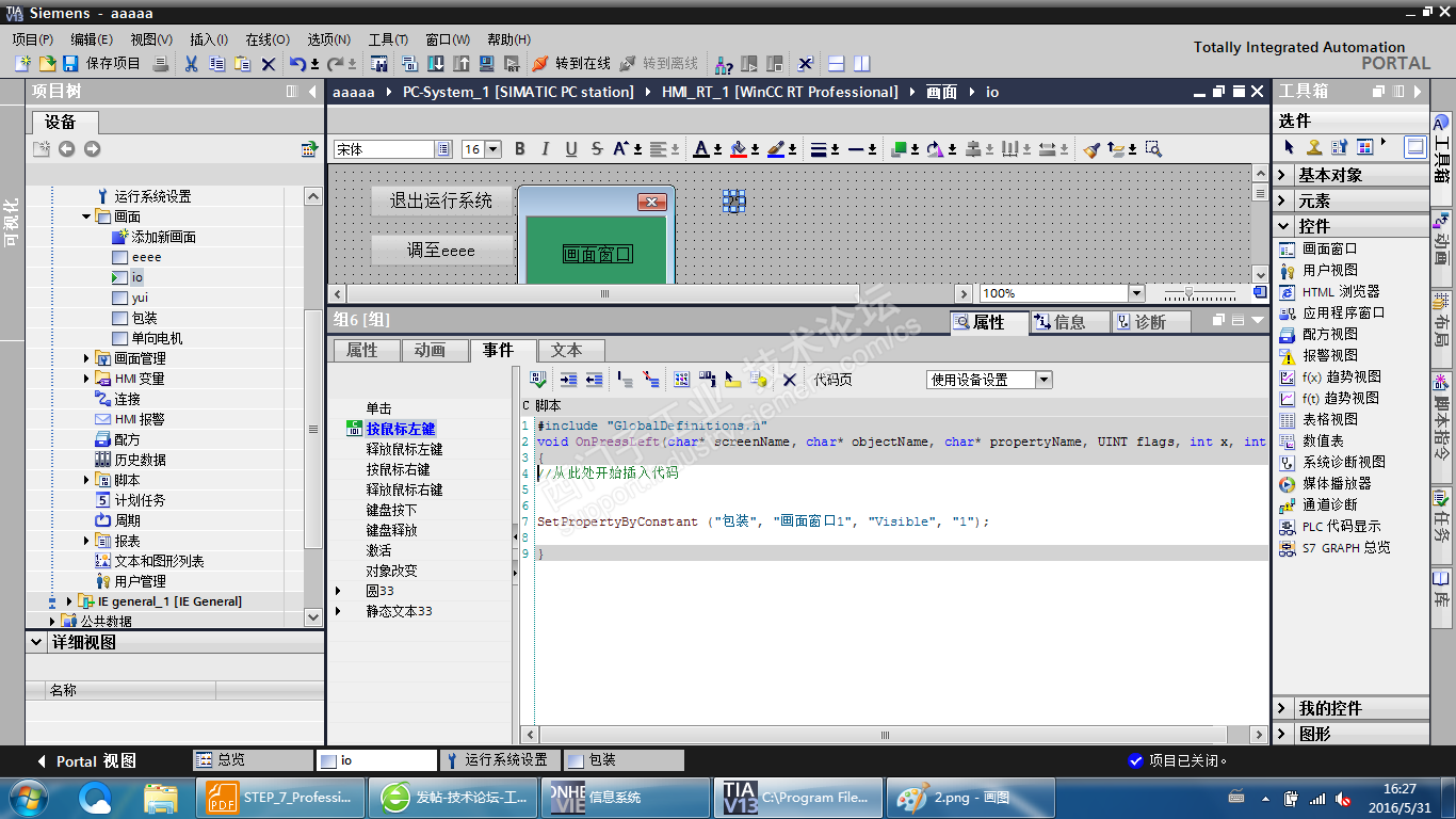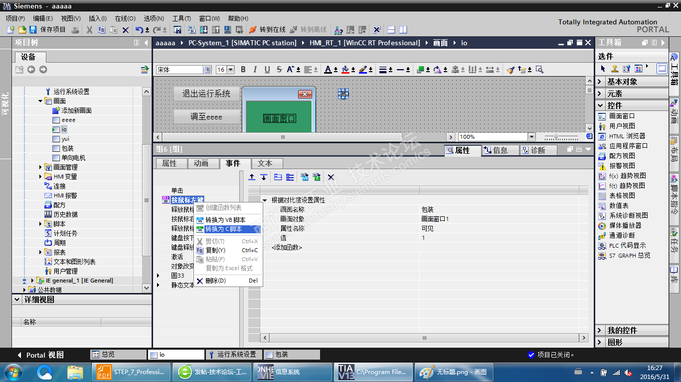 初学博图,之前上位都是wincc6.2或是7.0,现在使用博图做上位,想显示画面窗口,在按钮的“事件”,左键,选择了“根据对比图设置属性”,显示画面窗口,在运行界面正常,当我设置为转换为C语言后,就无法实现画面窗口的显示了,同时转化为代码“SetPropertyByConstant ("包装", "画面窗口1", "Visible", "1");”