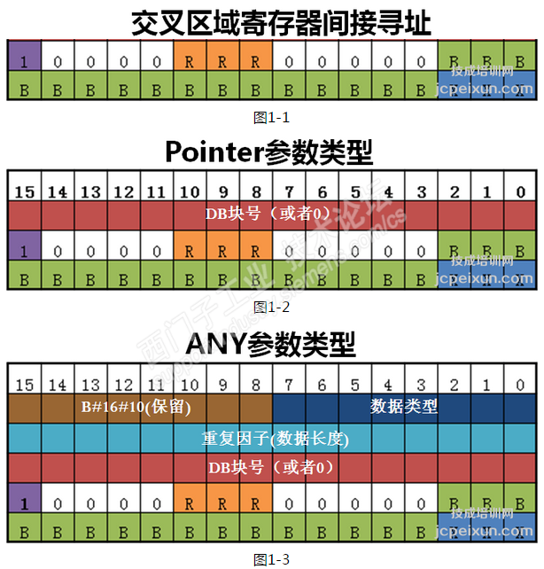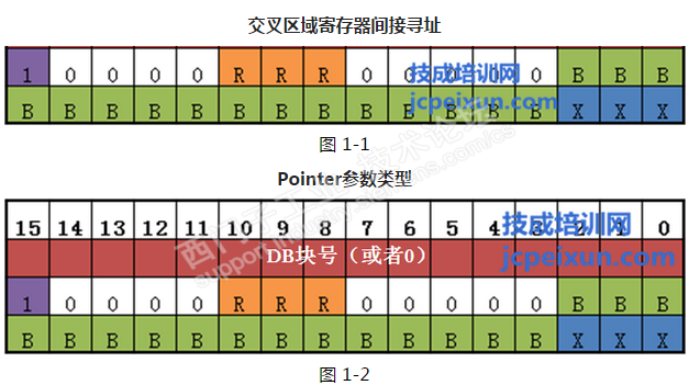 交叉区域寄存器间接寻址在地址寄存器中的排列可分为五个区域,分别是存储位信息的区域,存储字节、字、双字信息区域,存储区域地址标示符信息区域,交叉区域指针标识位和无效区域。