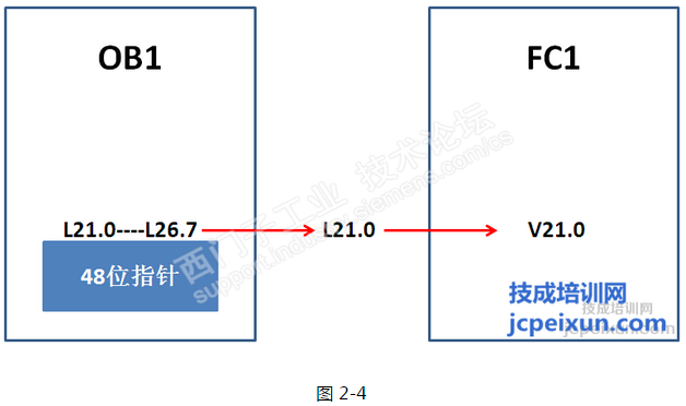 上面我们已经分析出来FC1中的V21.0实际指的就是OB1中的L21.0因此我们可以判定Pointer参数类型的48位指针就是存放在OB1的L区中并且起始地址就是L21.0,由于是48位的空间所以Pointer参数类型的48位指针占用的就是OB1中的L21.0到L26.7共48位空间,其中LB21和LB22是存放DB块编号信息的,LB23~LB26是存放地址信息的。