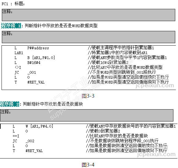 图 2-1至图 2-3所示程序的作用是将DB1.DBX0.0偏移2.0后的字的空间存放整数100也就是给DB1.DBW2赋值100,本身程序非常简单,也没有什么实际意义,但是从这个程序中大家必须搞清楚两个问题,第一图 2-3中红框中的地址V21.0是什么意思。第二Pointer参数类型是48位存储空间的指针,48位的空间到底位于PLC的哪个存储区。只要我们把这两个问题搞懂了,就可以说对Pointer参数类型彻底搞懂了。