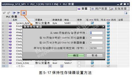 标志位存储区位于CPU的系统存储器,地址标识符为“M”。对S7-1500而言,所有型号的CPU标志位存储区都是16384个字节。在程序中访问标志位存储区的表示方法与访问输入输出映像区的表示方法类似。同样,M区的变量也可通过符号名进行访问。M区中掉电保持的数据区大小可以在“PLC变量”—>“保持性存储器”中设置,如图5- 17所示。