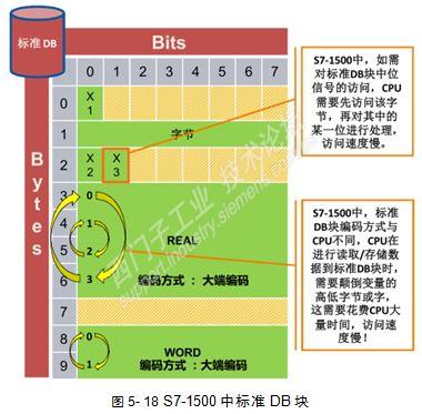 优化DB和标准DB在S7-1500 CPU中存储和访问的过程完全不同。标准DB掉电保持属性为整个DB,DB内变量为绝对地址访问,支持指针寻址;而优化 DB内每个变量都可以单独设置掉电保持属性,DB内变量只能使用符号名寻址,不能使用指针寻址。优化的DB块借助预留的存储空间,支持“下载无需重新初始化”功能,而标准DB则无此功能。图5- 18所示为标准DB在S7-1500内的存储及处理方式。