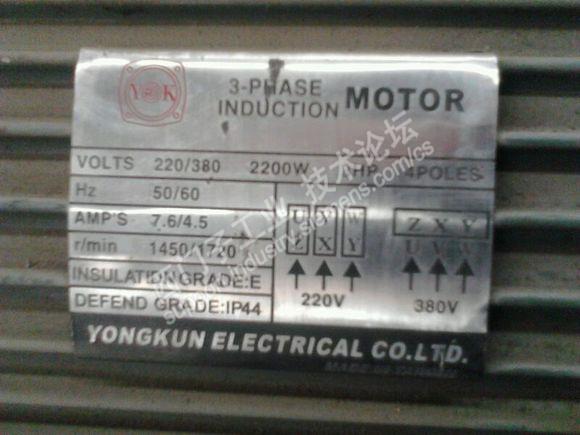 但通电后4A的空开没多久就跳了。我觉得奇怪,又量了一下电机,好的。电机转向,也对的。于是就把联轴器脱开。一开空开还是跳。于是找来了钳形表,一卡吓一跳,电流有36A。三相电流还平衡的。什么鬼?于是找来接线图,注意到 三角形接法 上标了个低电压 Y形接法上标了个高电压。于是我就把接线改成Y形接法。