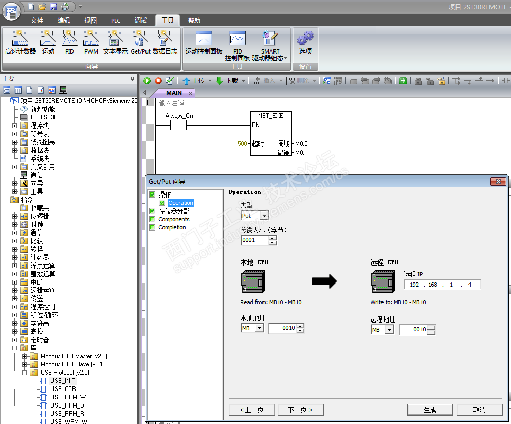 方法很简单,分别给两个PLC设置同一个网段不同的IP地址,如下图,打开工具,选择GET/PUT,然后添加一个操作,配置需要交换的数据就可以了,然后PLC自动生成子程序,在main里调用这个子程序就可以了,只需要单边编程,另一边不用管。