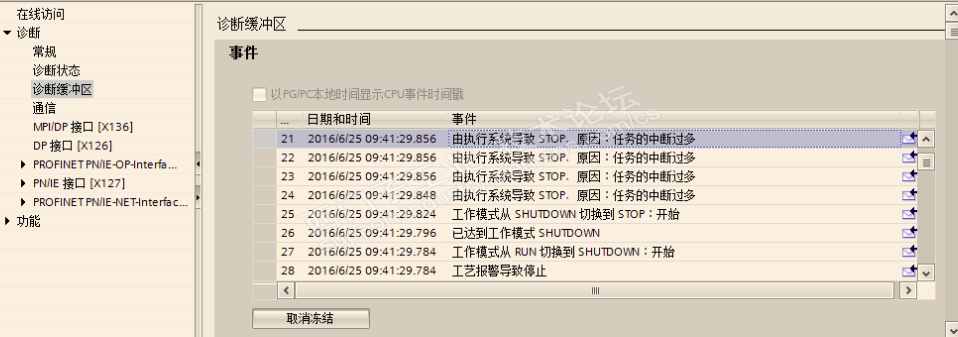 435-2 DP带17根轴,5根虚轴,CPU偶尔STOP停机,附图是诊断信息,有什么办法处理?