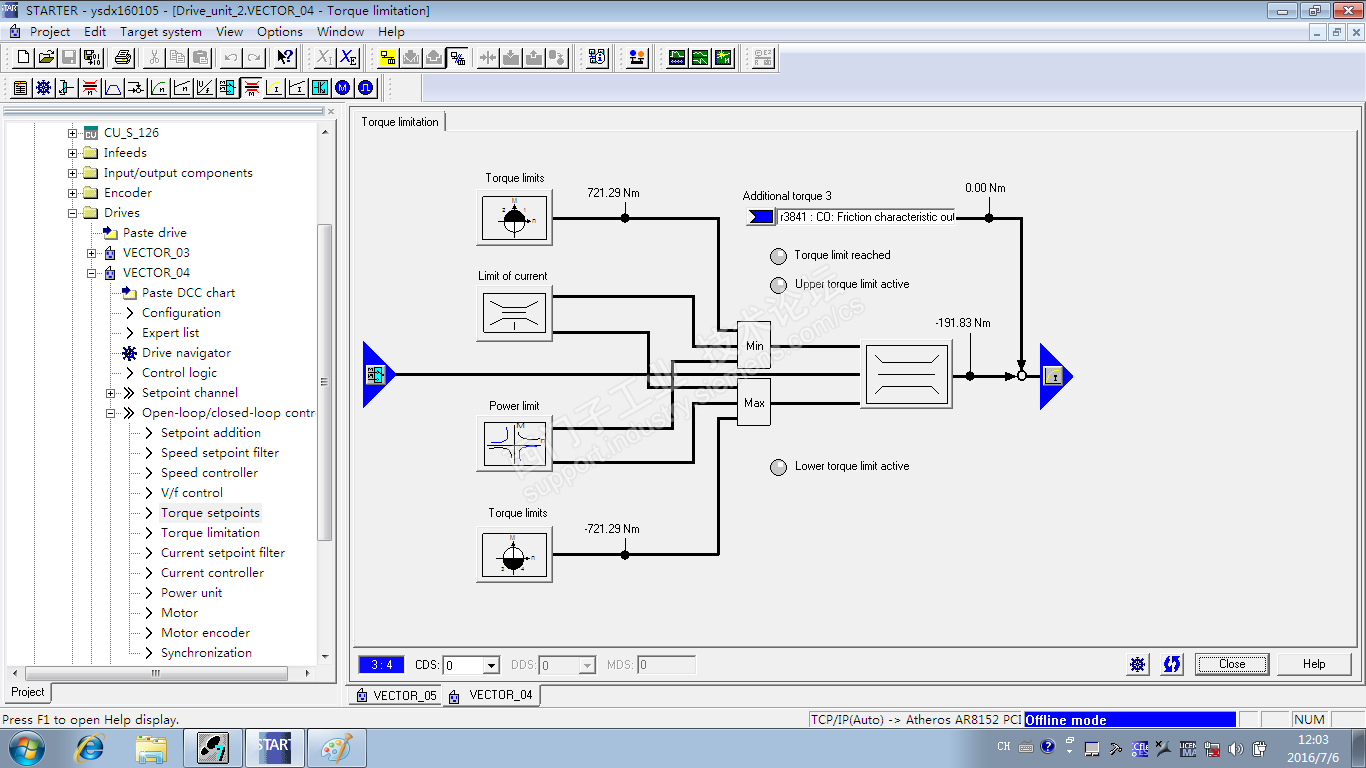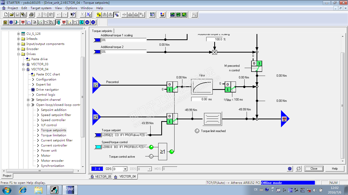 都带编码器,控制方式采用PLC DP通讯模式,通过改变P1501的值改变转速/转矩控制模式.目前M1电机为转速控制,M2/M3电机为转矩控制,当M2/M3两个电机的转矩给定为-50Nm,M1转矩给定为2000rpm,系统运行正常,此时M2/M3的速度为710rpm左右。但是当将M1的速度给定增加到2250rpm时,三台电机的转矩突然加大,M2/M3的转矩给定依然为-50Nm,但是实际转矩为-180Nm左右,而此时的速度为800rpm左右,超出额度速度!