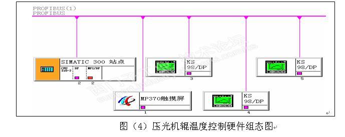 图(4)压光机辊温度控制硬件组态图,从图中可以看出,3个带西门子DP总线接口KS98温控器,西门子S7- 318-2DP PLC,西门子MP370触摸屏,通过西门子PROFIBUS-DP总线连接,采取通讯控制,触摸屏设定辊温度值和起停操作,温控器返回辊温度实际值及工作状态。要实现辊升降温自动控制就需要在原PLC程序基础上增加控制程序,在MP370触摸屏内组态新的控制画面。