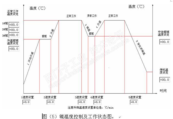 薄膜的成形就靠这3个保持恒定工作温度辊压延成形,辊升降温速度有严格规定,辊镀铬层和基材金属热胀冷缩率不同,如果升温和降温速度太快,会造成辊镀层局部龟裂,原厂压光机辊温度控制画面,画面功能单一,操作简单,在设定值方框内输入温度值即可使辊升降到设定温度,升降温过程时间完全由操作人员控制。