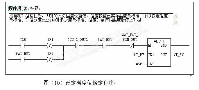 根据辊温度控制及工作状态图,很容易就设计出控制程序。如实现自动升降温控制是在程序上做一个可调的时钟脉冲,以实际输出温度值为基准,采用加法或减法运算定时增加或减小输入温度设定值,程序控制见图(10)。