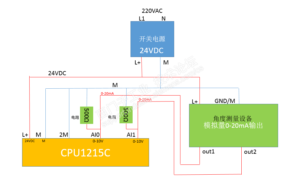 我是将电阻直接做在PLC-AI接口处。//能不能大概发一个图看看?(双绞线,焊好电阻;热缩管封上。)如果中间有接线(柜)端子,也是同样;不要将电阻做在端子处。//也就是说把电阻的一端引脚直接接入到M端,另外一端引脚采用双绞线连接,然后这个双绞线其中一条与PLC-AI连接另外一条与模拟量的反馈信号(0-20mA)连接,是这样理解吗?