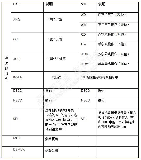 LAD字逻辑指令可以对BYTE(字节)、WORD(字)、DWORD(双字)或LWORD(长字)逐位进行“与”、“或”、“异或”逻辑运算操作,而STL只能对WORD(字)或DWORD(双字)进行操作。字逻辑指令还包含编码解码等操作。字逻辑指令参考表6- 10。