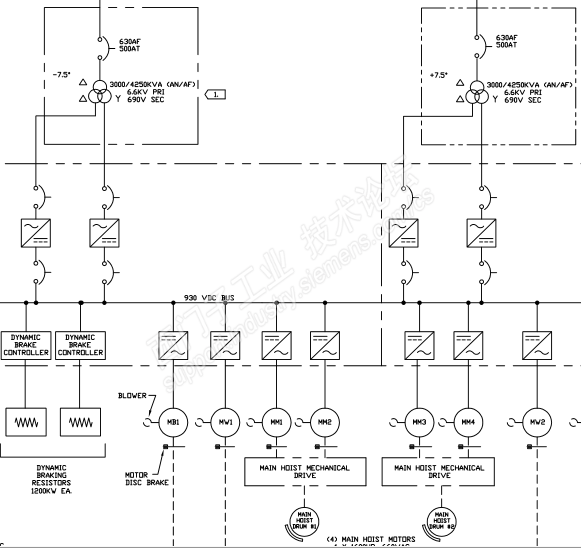 起重机系统采用左右两路供电,当损失一侧变压器时,可以保证吊机降速度使用,转矩下降不大保证起重安全。