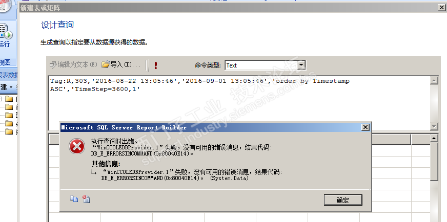 现在问题是,我查询的时间如果短的话是没有问题的的,数据可以正常的查询出来.但是一旦查询的时间比较长就会报错。错误信息为:DB_E_ERRORSINCOMMAND(0x80040E14)