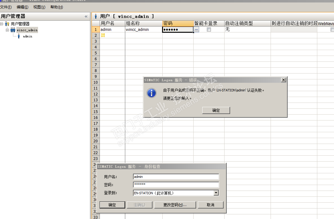 打开wincc的“组态 SIMATIC Logon”登录wincc用户管理创建的账户总是提示密码不正确。可是我确定密码是正确的。我在windows创建了和wincc用户管理相同的组和账户,登录又提示“没有为 '组态 SIMATIC Logon ' 注册用户 'admin' 。因此,访问被拒绝。”
