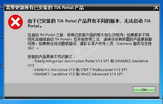 昨天升级的TIA V13 ,升级时候有过版本不一致的提示,没太注意,现在软件打不开了,提示版本不对,仔细查看发现有一个软件没有升级到 V13 SP1 ,单独下载后安装,提示系统版本不对,十分不解,看看大侠是否遇到此类问题?
