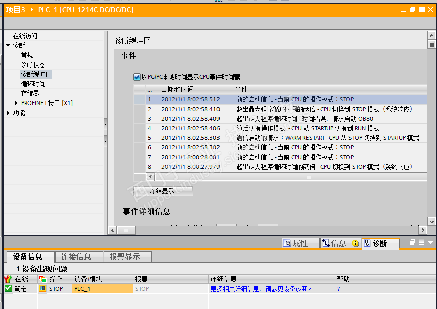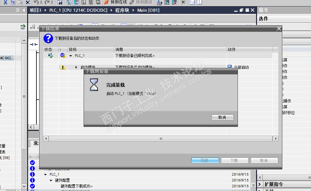 然后下完之后,PLC那里STOP/RUN 直接就是黄灯,看了一下是下载完成那里有一个警告,如图2