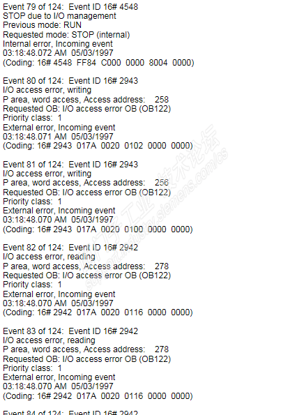 这是其中一次,插槽5,6模块的所有模拟地址出现访问错误(有添加OB122 OB82 OB86 OB121等各种块),然后是4548 I/0管理错误导致停机,然后在有一些别的故障码