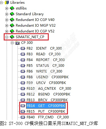 通信接口为S7-300 CP通信模块时,需要使用SIMATIC_NET_CP 库中PUT/GET指令,如图2所示。
