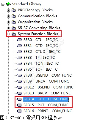 S7-400 CPU不区分通信接口,需要使用System Function Blocks 中的SFB14/SFB15指令块,如图3所示。