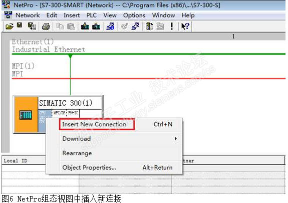 打开“NetPro”设置网络参数,选中CPU 315-2PN/DP,在连接列表中建立新的连接。步骤如图6所示。