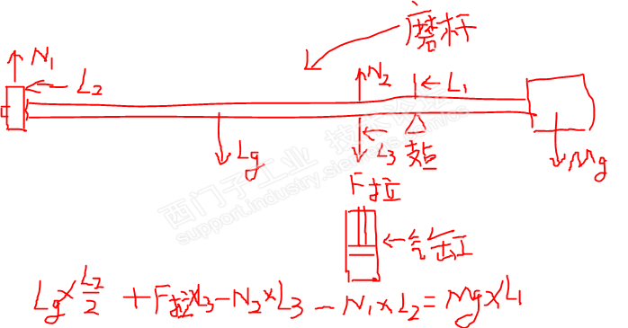是一根磨杆,杠杆平衡原理,通过伺服阀控制气缸拉力,从而使N1变大小。Lg是模杆重量,L2是磨杆长度,N2是气缸的背压,Mg是电机重量+配重。