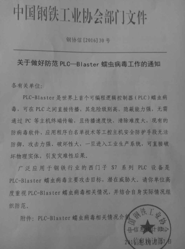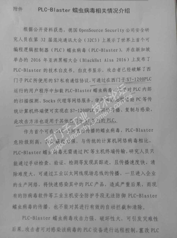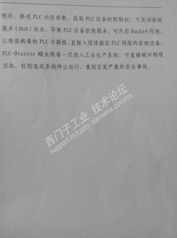 今天在微信上收到一份据称是“中国钢铁工业协会部门文件”,内容是关于做好防范PLC-Blaster蠕虫病毒工作的通知,在这个附件中列举了这个病毒的危害。我想问的,这个病毒如何查杀,如何预防,西门子公司对此有什么对策。因为现在西门子的产品应用很多,如果因为一个病毒的原因造成设备事故、人身事故那影响可就大了。