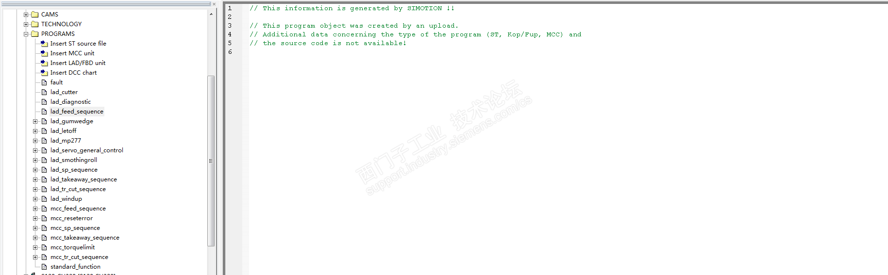 请看,这是上载的程序【CPU是simotion D 445 ,带CF卡那就是程序应该没有丢失】,可是为什么上传上来的程序是空的!只有程序段名称。