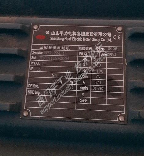 2015年凤凰炉供我厂的步进梁式加热炉两台助燃风机:天津风机厂+山东华力电机YVF2-355L-4-B3R-315kW变频,配ACS800-04P-400,output Imax 602A。铭牌上字迹很清楚,前后轴承型号也有,电机运行过程声音听着很平稳,可能是风机的原因,所以OK