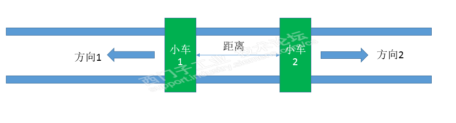 如下图片的设备,是两台小车在一个轨道上来回搬运物料的,要求 小车1 小车2 联动运行时要求两台小车的距离不能过大或者过小,要求误差是+—50mm