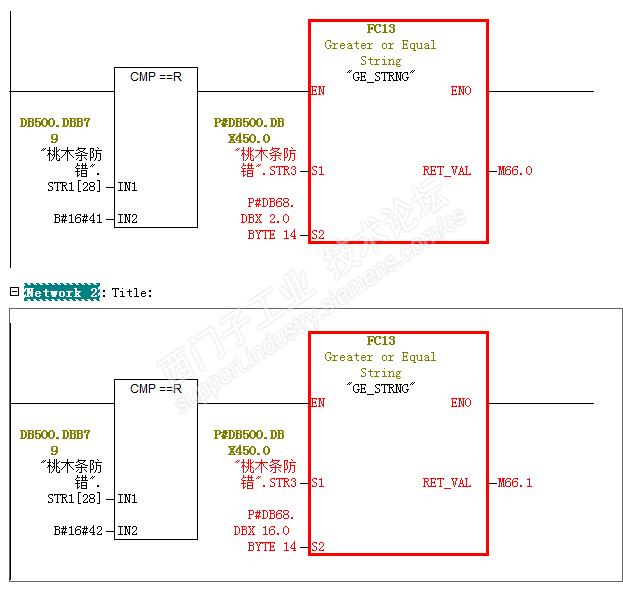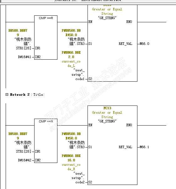 最近编写了一段字符串程序,使用的FC13 EQ_string可是编写完了显示正常,但是下载到PLC中却无法监控,上传上来之后,两个块显示红色。百思不得姐啊,小的,新生,老师们多指点,谢谢各位大神了。