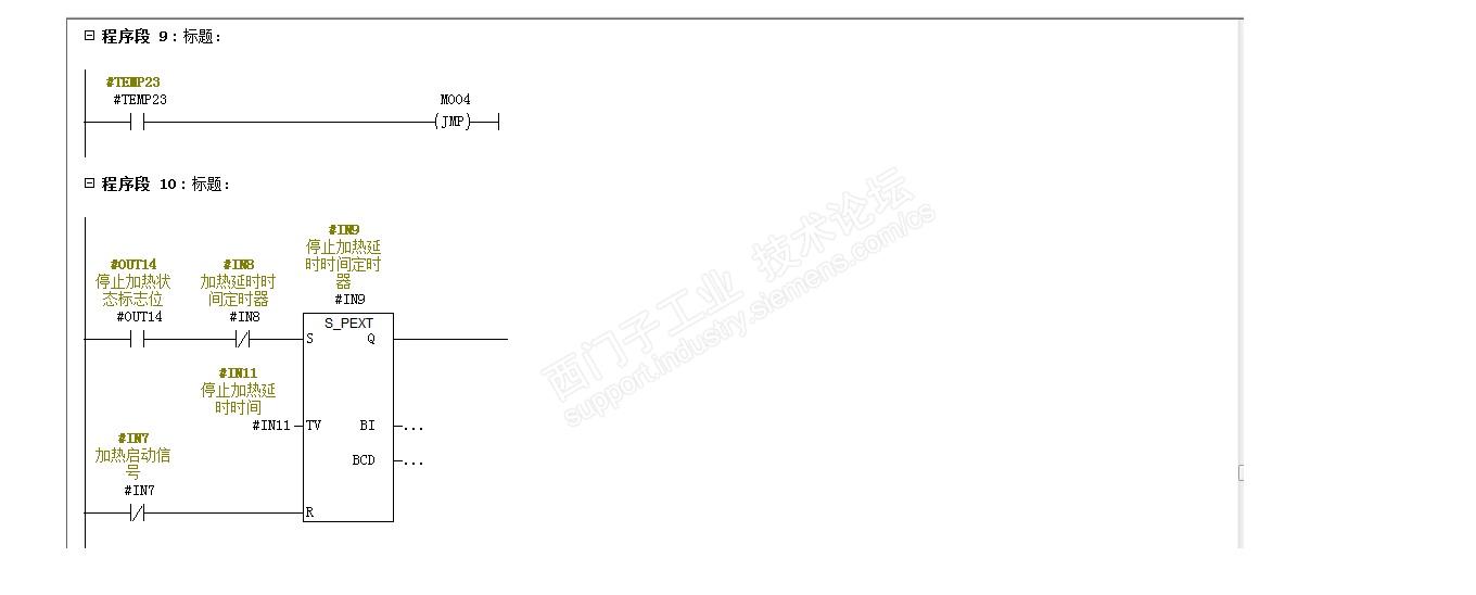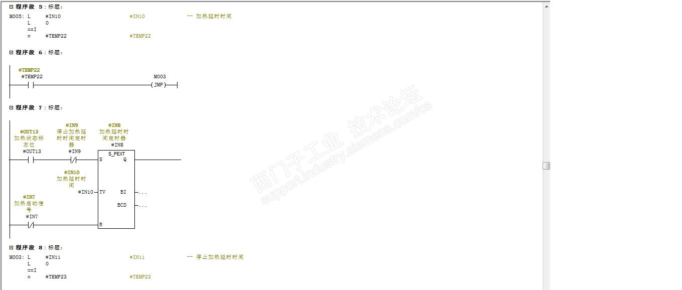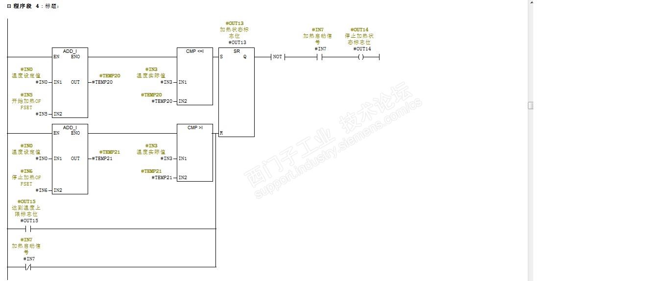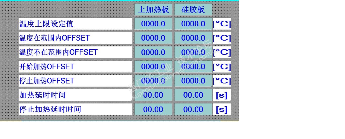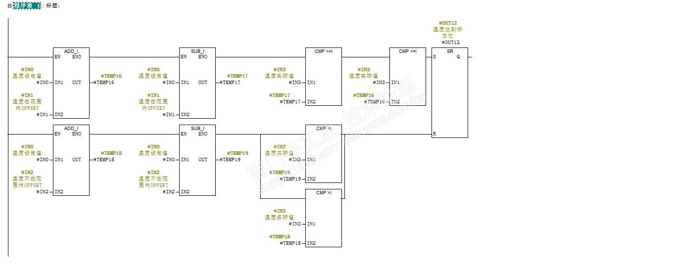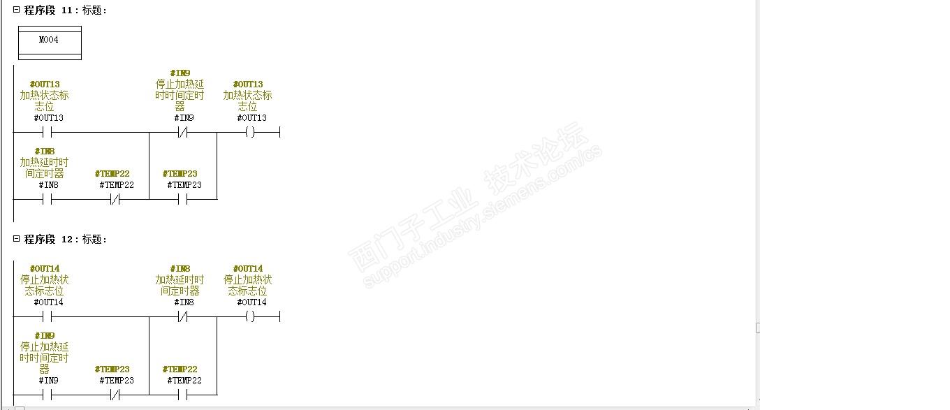 我一般温度在范围内OFFSET 设置为0.5,温度不在范围内OFFSET设置为1.0,开始加热OFFSET设置为 -1,停止加热OFFSET设置为0 。加热时间延时和停止时间延时设置要根据环境来适当调整。例如夏天环境温度很高,可以设置加热时间延时短点,相应的停止加热时间延时长点,冬天环境温度比较低,则设置停止加热时间延时长点,加热时间延时短点。通常这2个时间参数我都设置为1S 。通过调整这6个参数可以实现比较准确的温度控制。通过测试,温度精确度可以控制在1度左右。以下为触摸屏画面及程序截图。加热程序做成了标准块,使用时候直接调用就可以了。