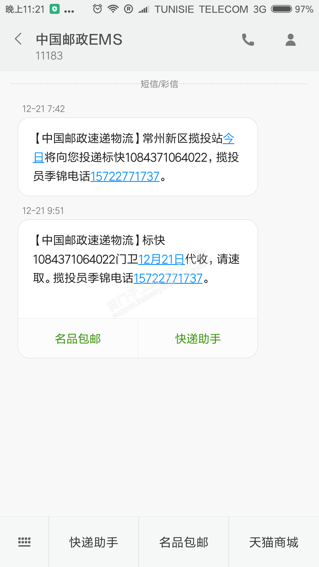 你们的T恤是用EMS邮寄是吗?今天我也收到短信了,已经签收了。不知道是不是T恤。