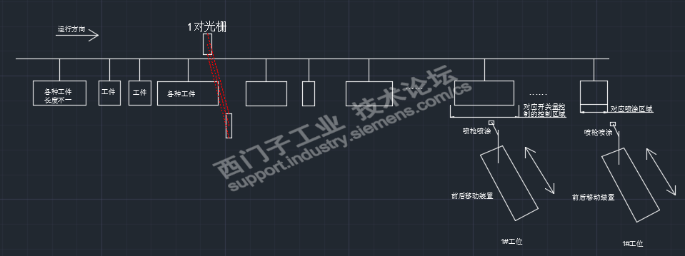 另外,在此基础上增加工件检测的宽度方向的检测光栅,通过RS485与PLC通讯,读取相应工件的宽度数据值,实现后面的每个工位的伺服电机控制的前后往复机构,根据对应当前的工件的实际宽度进行前后动作.(前后动作的位置区域,根据光栅的安装位置进行相应数据的定义).